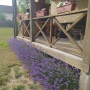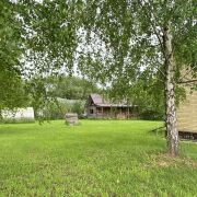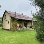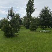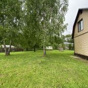 На участке много деревьев березы и сосны, газон, все ухожено и досмотрено. Участок угловой и поэтому соседи только с одной стороны.