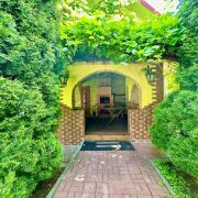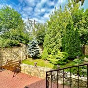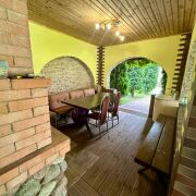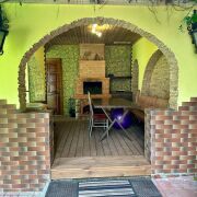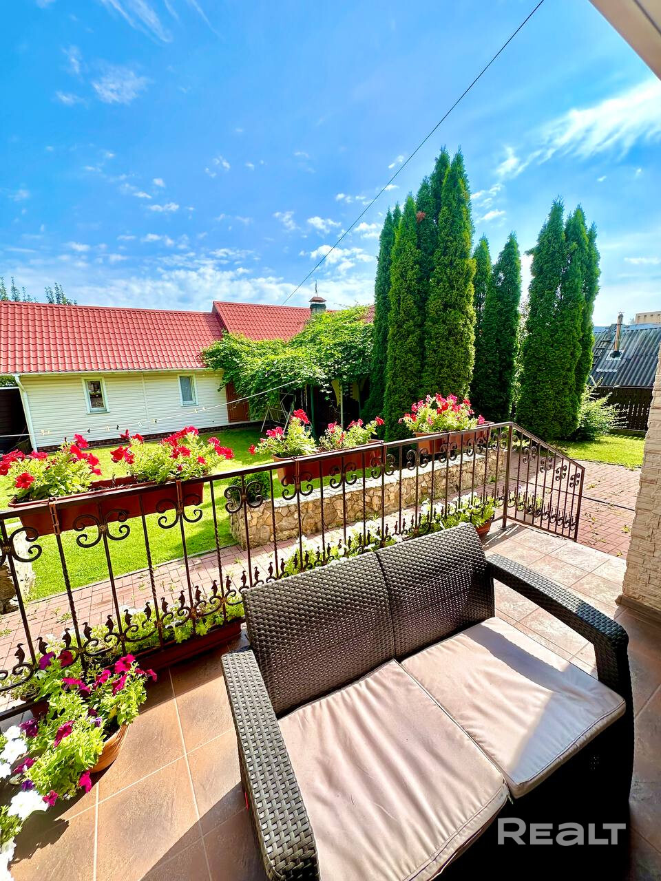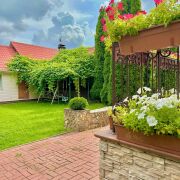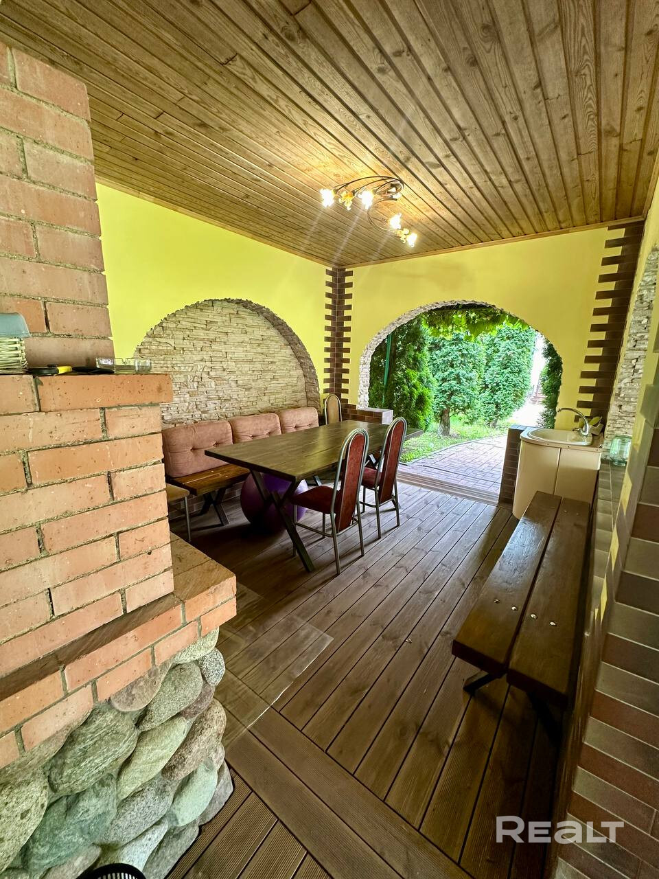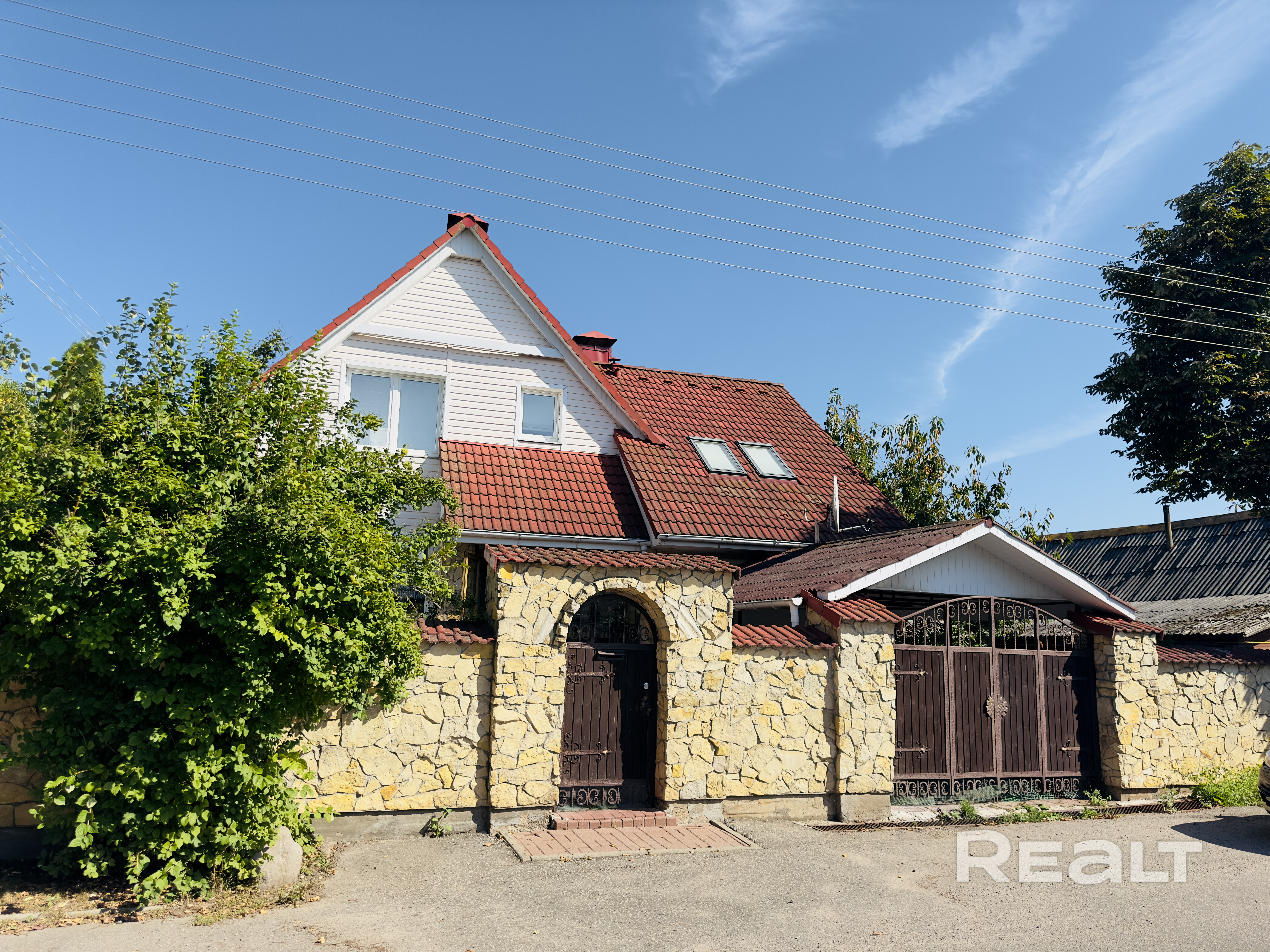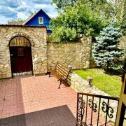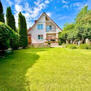 Вокруг дома расположен ухоженный участок. Сделан ландшафтный дизайн, высажены декоративные деревья. Имеются садовые насаждения в виде яблонь, черешни, сливы и прочее. Есть действующая баня с предбанником, камином и зоной барбекю, местом для проведения торжеств и времяпрепровождения в кругу семьи и друзей, гараж и беседка.