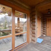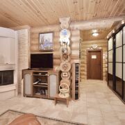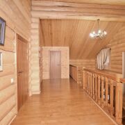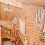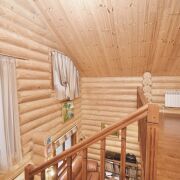 Первый дом (из сибирского бруса): Для ценителей натурального и дышащего дерева. Технология строительства с соблюдением всех сроков сушки и обработки — это гарантия долговечности и особого микроклимата. Двухсветная гостиная, столовая с выходом на террасу создает ощущение простора и единения с природой.