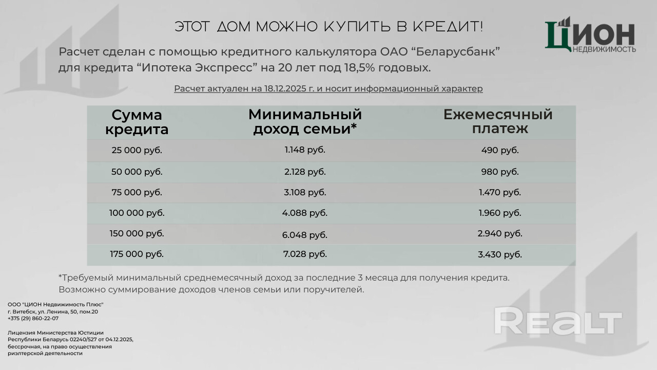 Кроме того, приобретение данного дома возможно с использованием кредитного продукта «Ипотека Экспресс» от Беларусбанка. Приблизительный расчет по кредитному калькулятору представлен во вложенных материалах. За более детальной информацией о кредитных условиях вы можете обратиться к нашему специалисту.