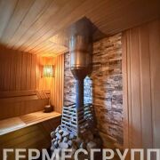 Установлен керамический дымоход с модулями из вулканической пемзы от немецкой фирмы «Schiedel», Печь Harviа, 200 кг камней, душевая. Уютная комната отдыха со смарт ТВ, холодильник, санузел.