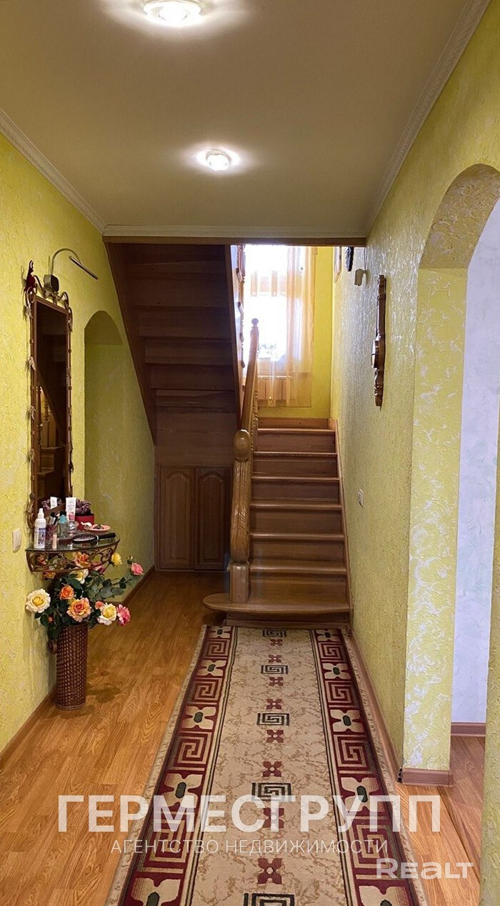 Материал стен кирпич, крыша металочерепица, на полу ламинат, плитка, дубовая лестница.