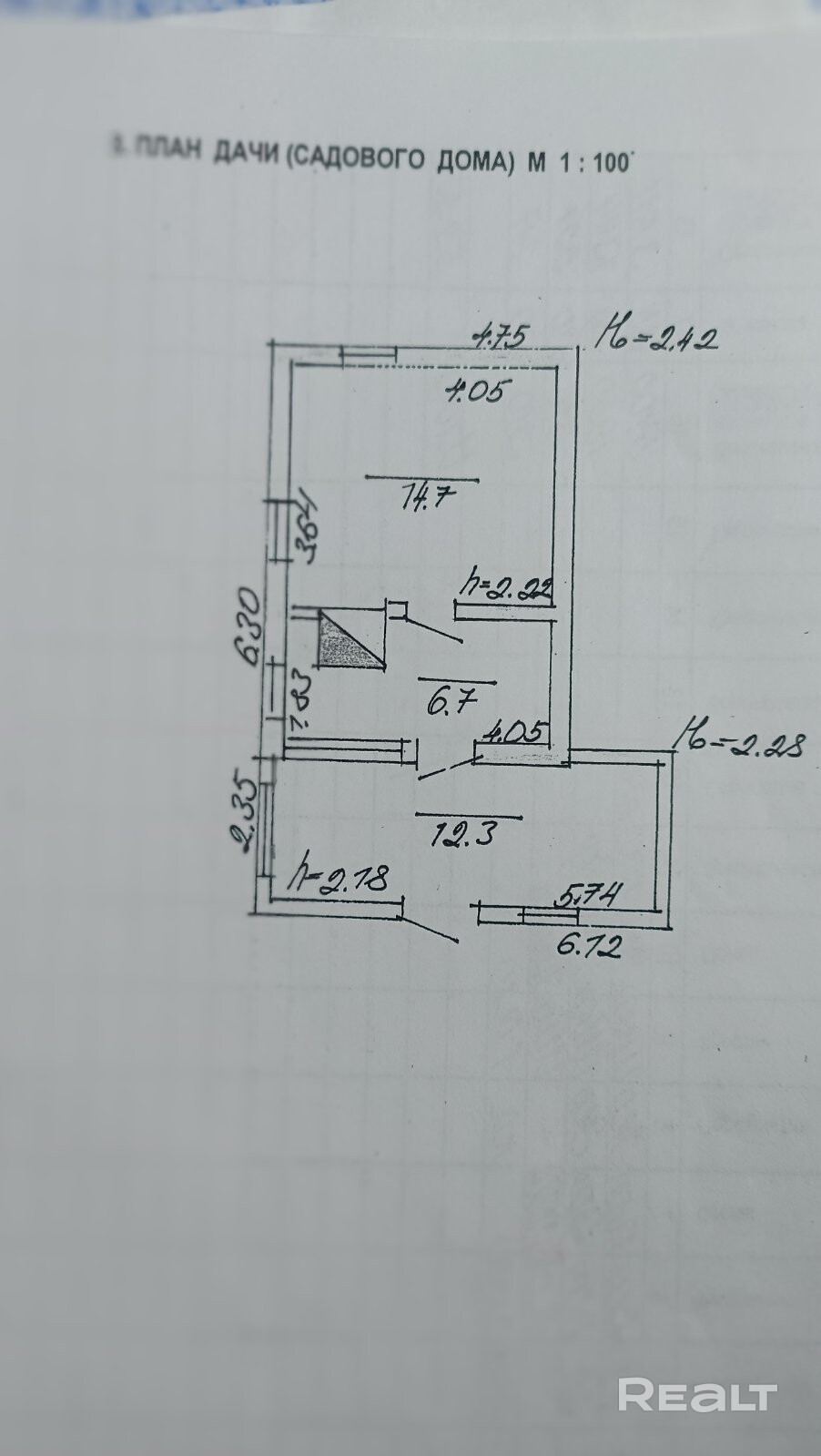 Продается дачный дом по адресу: СТ Зароновка-1. Садовый деревянный домик, обложенный кирпичом, с деревянной пристройкой, общей площадью 33,7 кв.м, жилая – 14,7 кв.м., кухня – 6,7 кв.м.,состоящий из 1 комнаты. Построен в 1985 году. Крыша - шифер. Отопление печное. Водоснабжение - колодец. Дом находится в хорошем состоянии. Окна деревянные, на окнах установлены решетки. Пол - доска. Площадь участка - 30,4 соток с плодово-ягодными насаждениями, огорожен сеткой рабицей. От Витебска 25 км. Несколько раз в день ходит дизель. Рядом автобусная остановка. Звоните для дополнительной информации или организации просмотра!