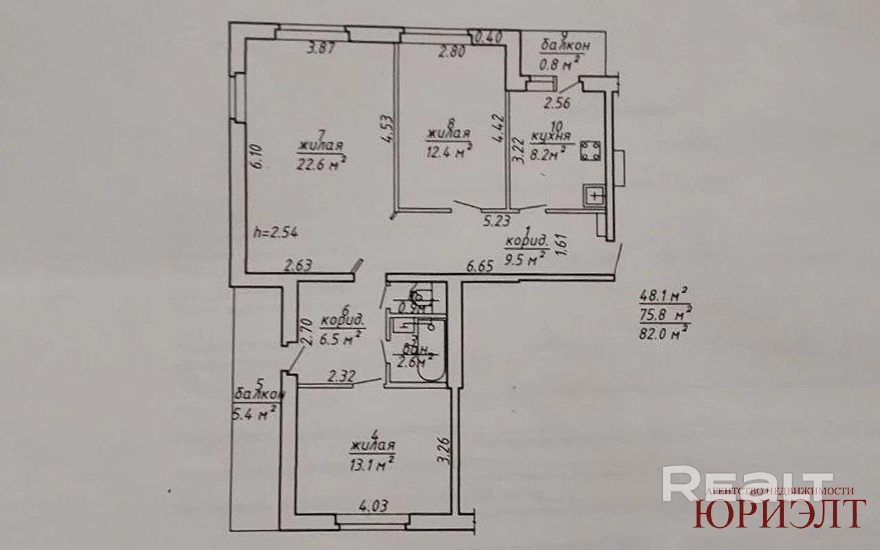 Общая площадь 75,8 кв.м., жилая 48,1 кв.м., кухня 8,2 кв.м.