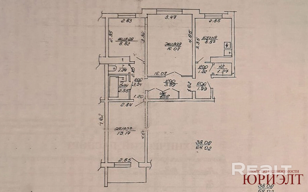 Общей площадью 64.02м2, жилая 38.08м2, кухня 8.82м2.