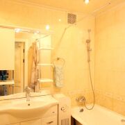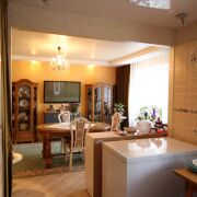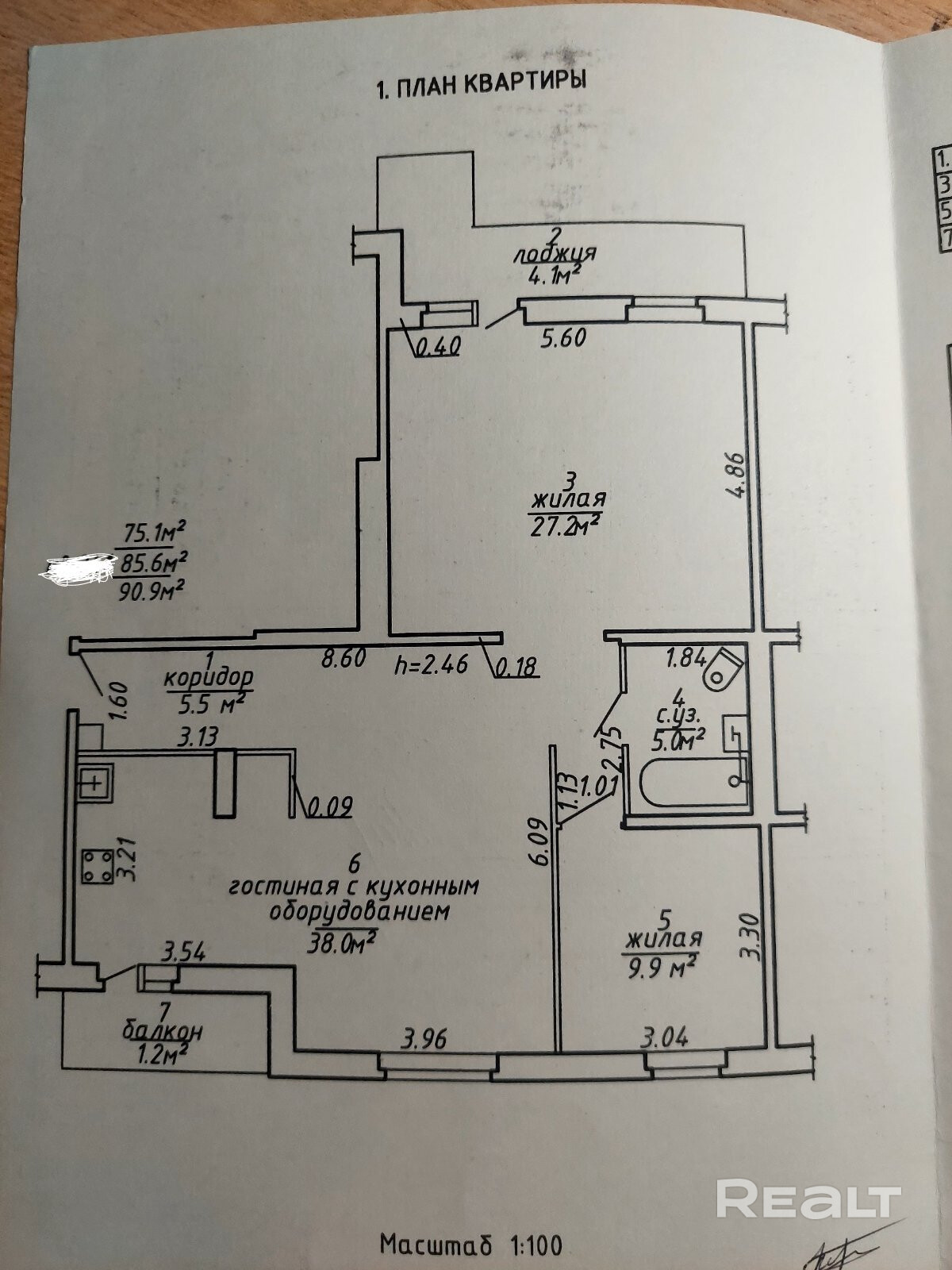 Общая площадь квартиры 85.6 М2, жилая площадь 75.1 М2, кухня совмещена с гостиной, совмещённый санузел.