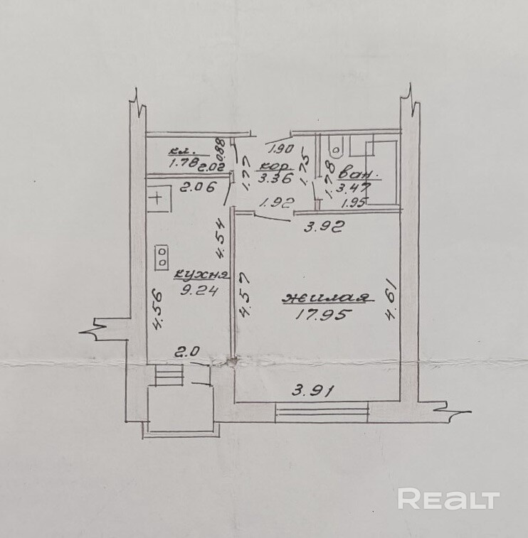 Общая площадь квартиры 35,8кв.м., жилая 17,95кв.м., кухня 9,24кв.м.