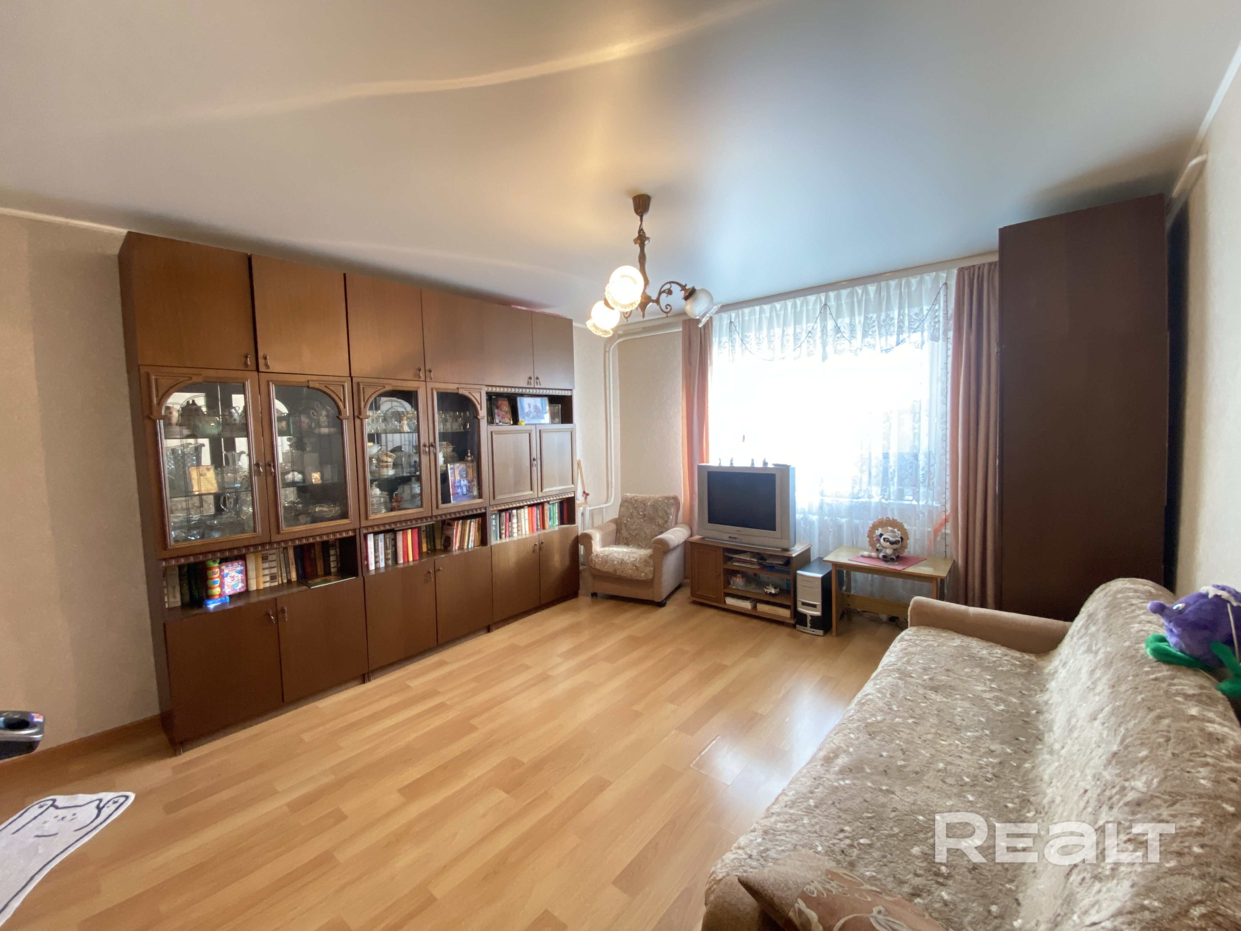 Во всей квартире стоят пластиковые окна. На кухне и в коридоре на полу лежит плитка , в комнате -ламинат. В коридоре стоит шкаф-купе.