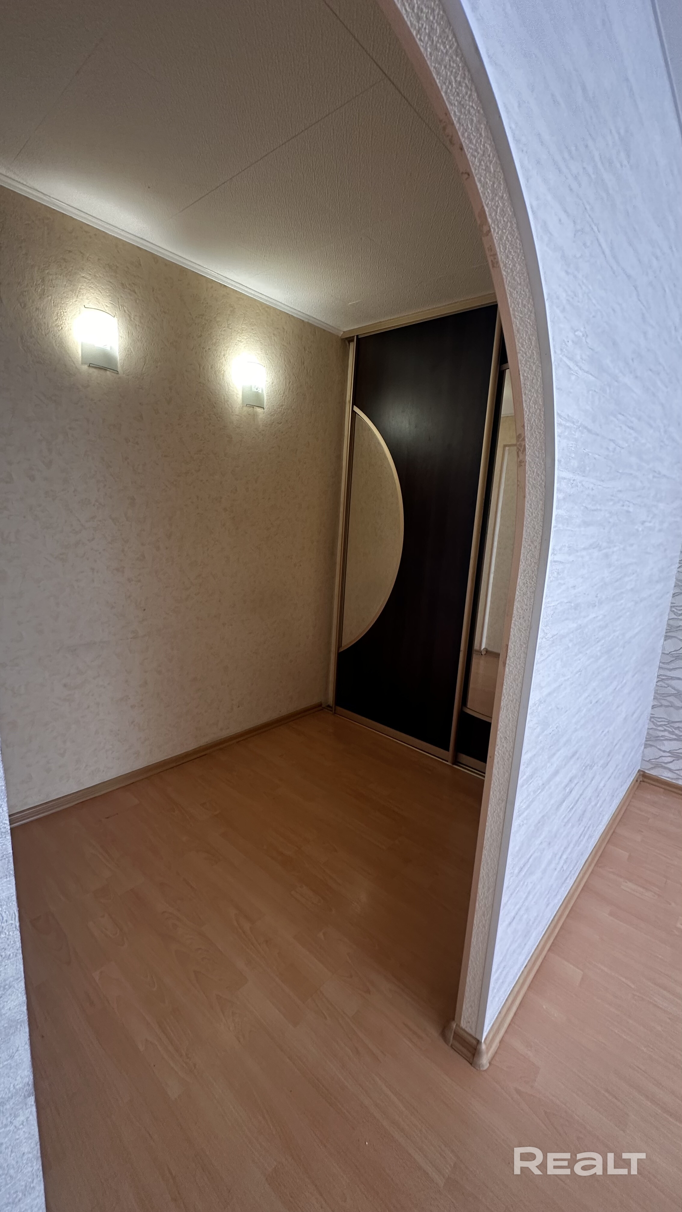 Дилая комната зонирована на 2 части, в одной из которых установлен шкаф-купе, который остается новым хозяевам.