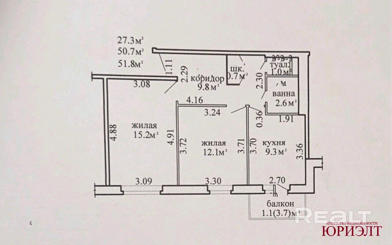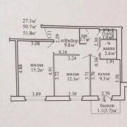 Общей площадью 50.7 мкв, жилая 27.3м2, кухня 9.3м2.