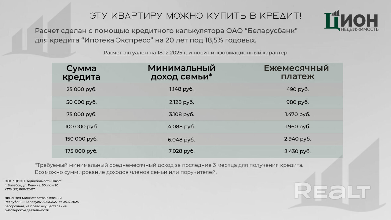 Кроме того, приобретение данной квартиры возможно с использованием кредитного продукта «Ипотека Экспресс» от Беларусбанка. Приблизительный расчет по кредитному калькулятору представлен во вложенных материалах. За более детальной информацией о кредитных условиях вы можете обратиться к нашему специалисту.