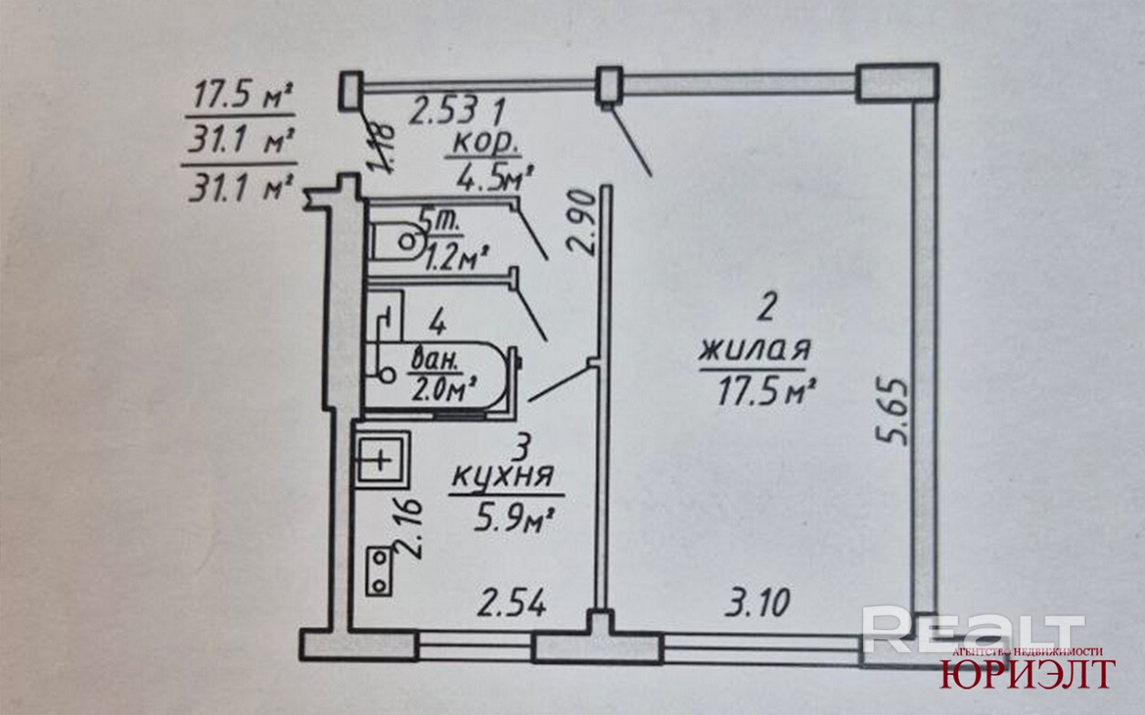 Общая площадь объекта составляет 31,1 м2, жилая площадь — 17,5 м2, площадь кухни — 5,9 м2.