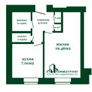 Общая площадь квартиры 34.4 м2, жилая 19,5 м2, кухня 7 м2.