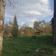 Дом с участком 12 соток,с одной стороны установлен забор из металопрофиля 28 м,с другой высажены туи,с третьей залиты столбы для забора.