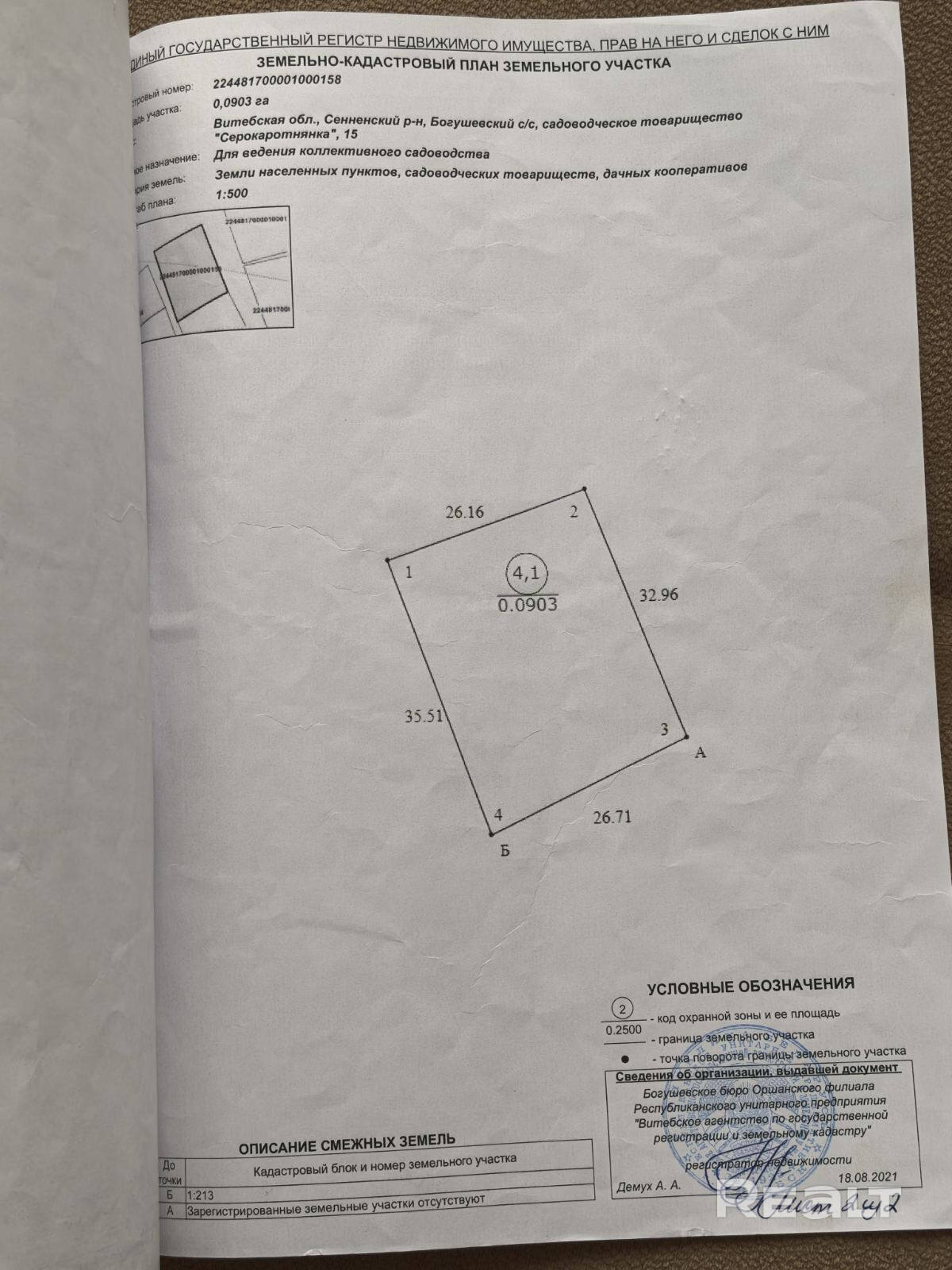 Продается земельный участок с домом, расположенный в СТ Серокаратнянка, Витебская обл., Сенненский р-н, Богушевский с/с , д. Коленьки,15 Земельный участок площадью 9,03 соток находится в частной собственности, расположен на берегу живописного озера - это шикарное озеро, расположенное всего в нескольких шагах от дома. На участке расположен бревенчатый дом, крыша – шифер. Площадь дома, метров-36кв.м., технический паспорт, свидетельство о государственной регистрации дома имеются. Торг уместен.