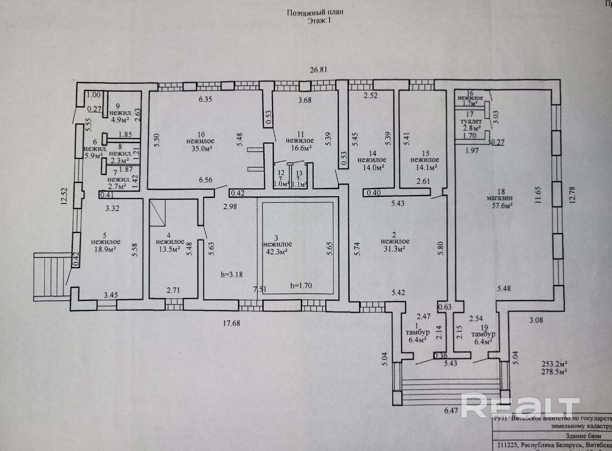 Продается здание, по адресу: Лиозненский р-н, вблизи аг. Пушки. Назначение: здание специализированное для бытового обслуживания населения – здание бани. Общая площадь – 278,5 кв.м., разделено на 10 отдельных помещений. Здание — одноэтажное кирпичное, построено в 1989 году. Высота потолков – 3,18 м. Есть естественное освещение. В здании проведены электросети 220В и 380В, отопление осуществляется через котел на твердом топливе. Рядом проходит газовая труба. Здание требует ремонта. Участок 16,62 соток (право аренды по 13.10.2118г), целевое назначение: для обслуживания здания бани. Звоните для получения дополнительной информации или организации просмотра!