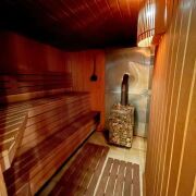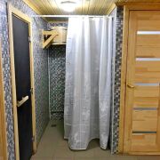 Здание сауны (баня на дровах) – 103,3 м.кв. Общая вместимость: 12 человек. В бане два парных блока с комнатой отдыха и летней верандой. Каждый парной блок имеет отдельный вход и рассчитан на 6 человек. В каждом парном блоке: предбанник, душ, санузел, парная.